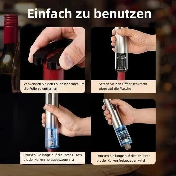 5-in-1 Gift Set: The 5-in-1 Electric Wine Opener Set includes Automatic Corkscrew x1, Foil Cutter x1, Wine Pourer x1, Vacuum Stopper x1, Display Base x1. The base is for storage only and cannot directly charge the bottle opener.